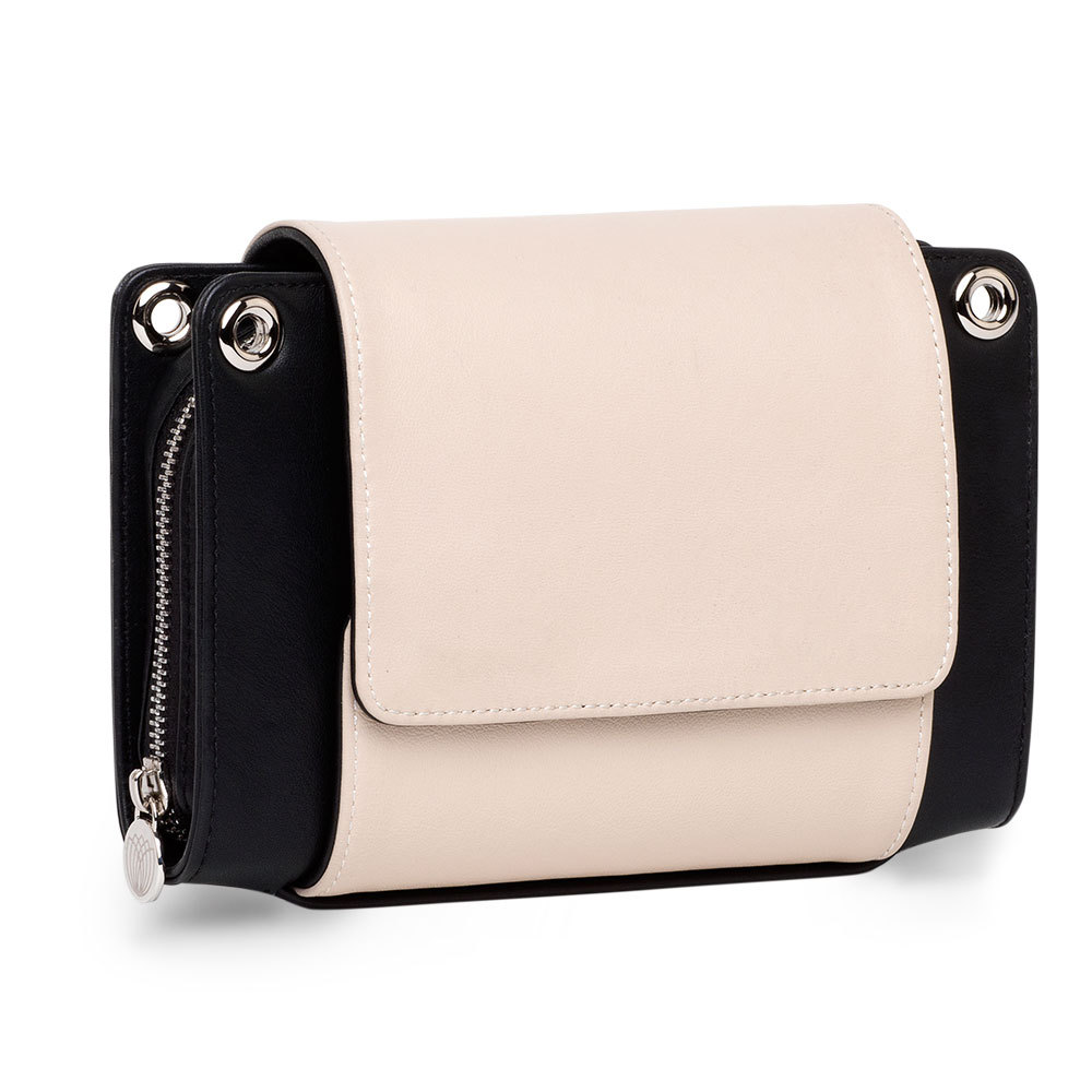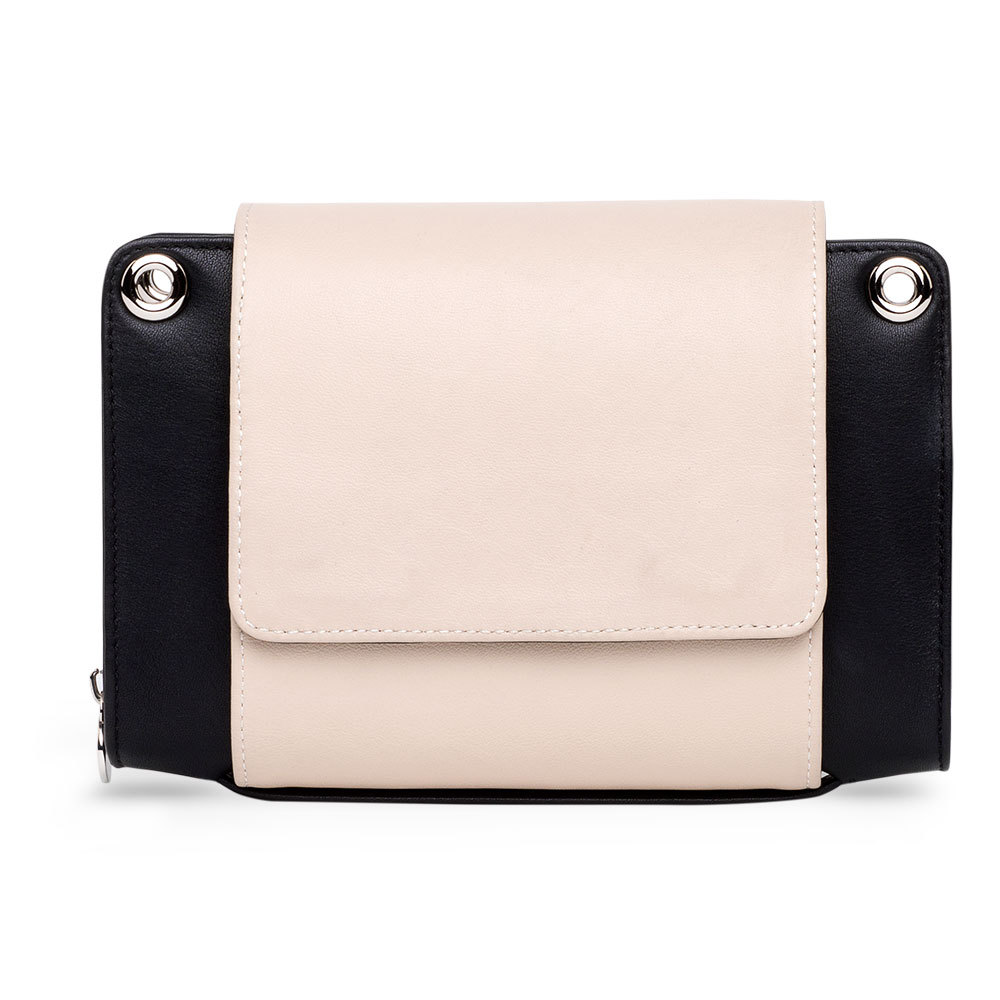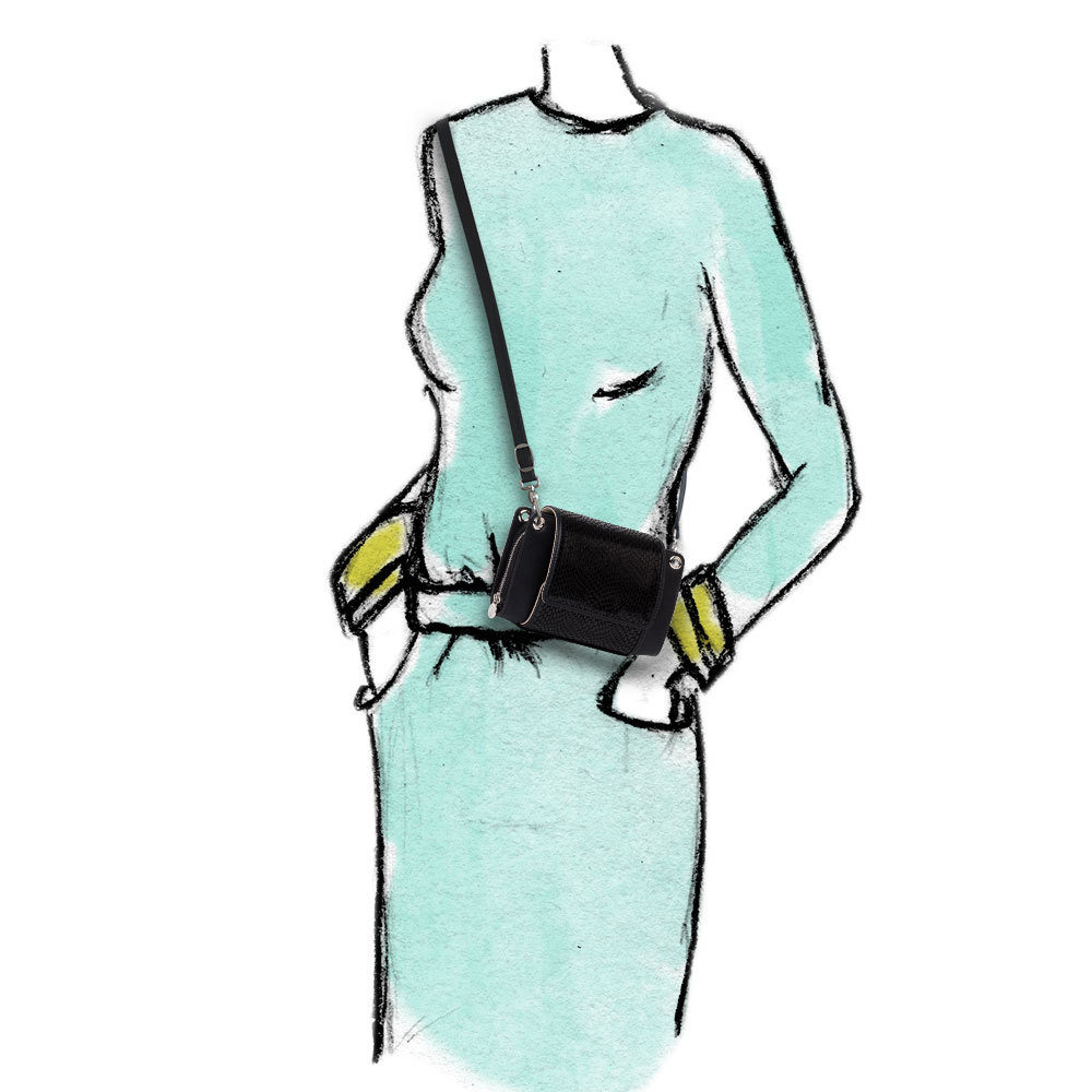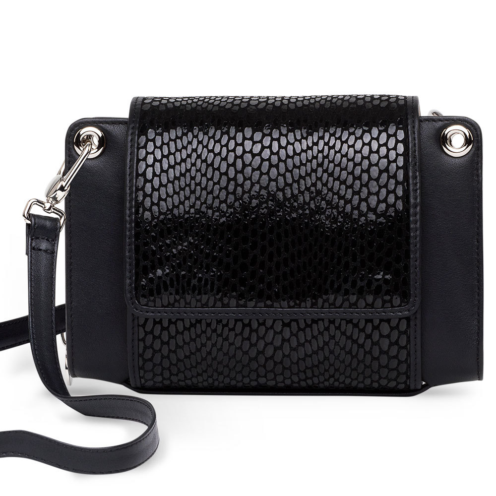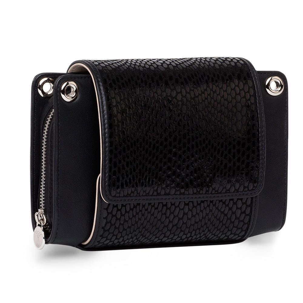 Our black cow leather with its exceptionally shimmering reptile print looks classy and luxurious. The flip side creates an elegant color-block effect with ivory-colored leather.