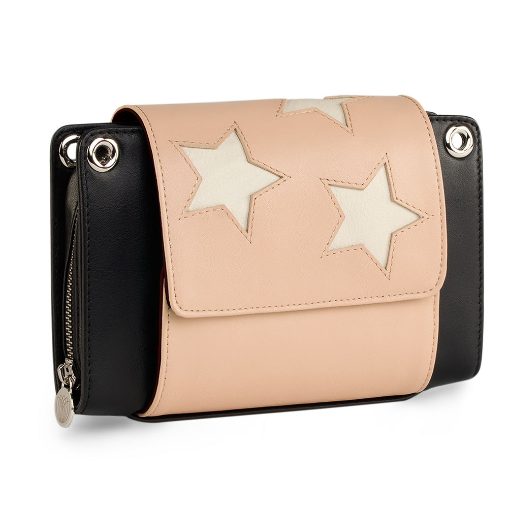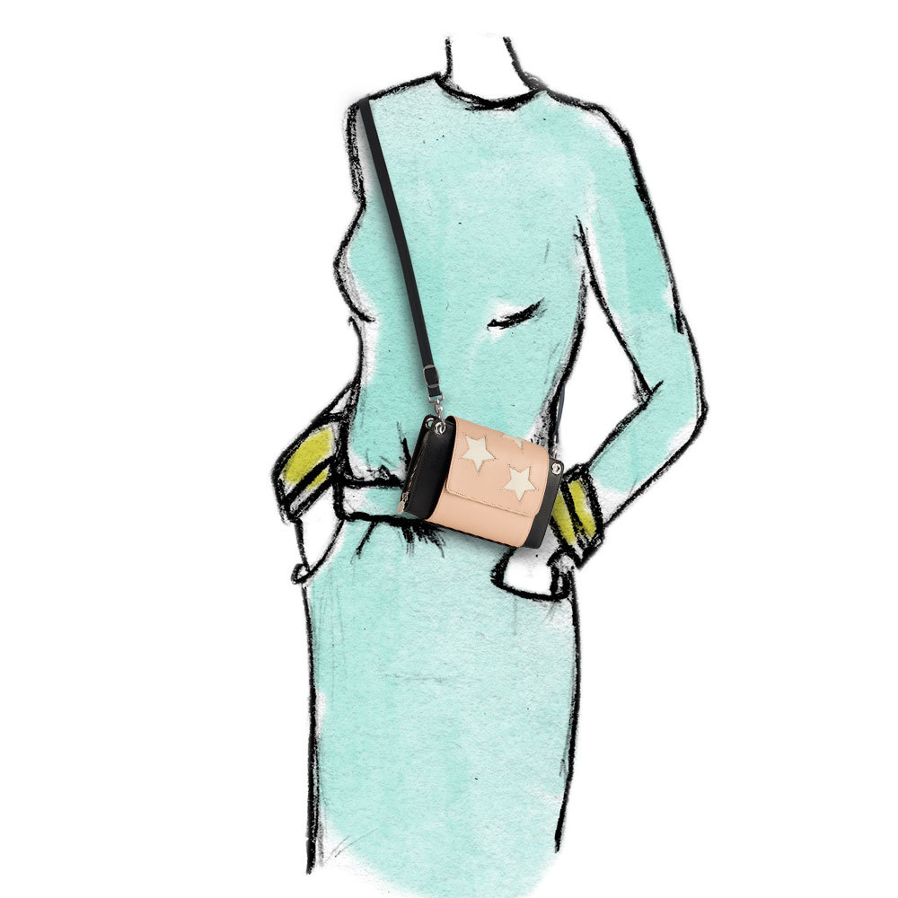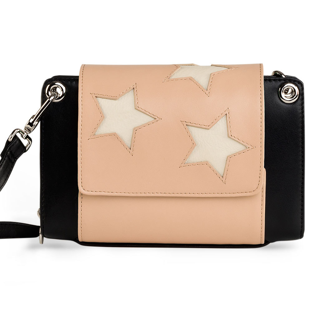 The crème-pink soft cow leather and ivory stars create an elegant contrast of rock & chic! Stylishly minimalist presents is the backside made of bordeaux red structured leather.